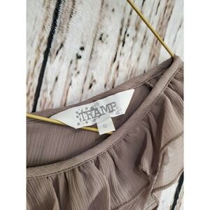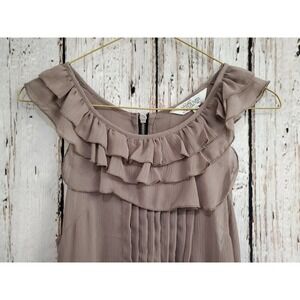 Women's size small Tramp blouseSheer materialRuffles at the necklineTuxedo pleated details in the frontExposed back zipGreat preowned condition; no stains, tears or odors.