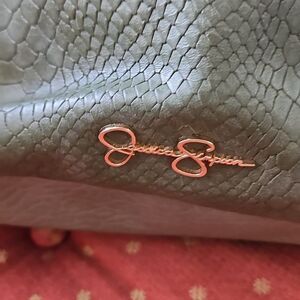 Jessica Simpson's stunning green shoulder bag featuring a striking snakeskin pattern. Perfect for any occasion with zippered close and two zippered back pockets. This is in great previously owned condition.