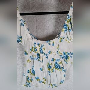 This elegant women's top features a beautiful floral design with blue and green hues. Perfect for a casual day out or a special occasion.