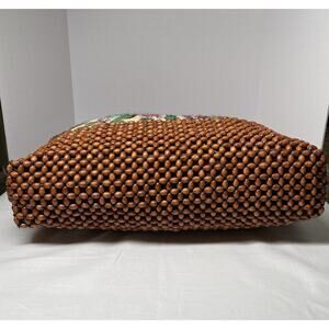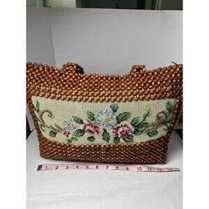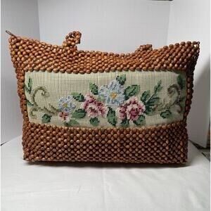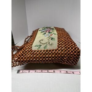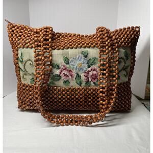 Vintage 1970s Boho Retro Chic Wood Beaded Needlepoint Design Shoulder Bag Purse