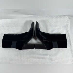 Elegant Yves Saint Laurent Rive Gauche velvet ankle boots with smooth leather cap toe and wide grosgrain band detail. Sculpted stacked block heel with side zip closure and engraved YSL pull. Understated, classic luxury.
