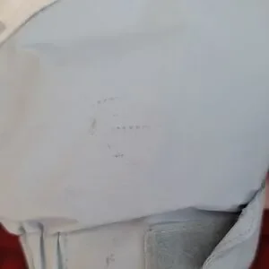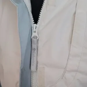 Stay warm with this Columbia ski jacket. Features a white and light blue design. Ideal for snowy adventures. In fsir to good condition. Has some marks on the sleeves, shown in pictures above.