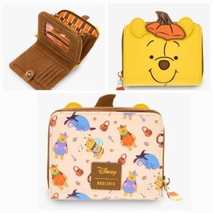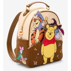 NEW 2025! Disney Winnie the Pooh and friends Halloween magnetic varioua costumes backpack and corduroy halloween wallet set, featuring the beloved character from the franchise. The medium-sized backpack in multicolor with magnetic closures is perfect for fans of Winnie the Pooh to showcase their love for the character. The set is a fun and practical way to carry essentials while also showing off Disney style and collectibles.