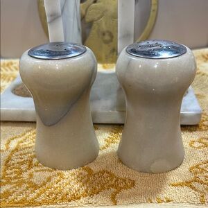 Elegant Vintage marble salt and pepper shakers with a matching Napkin holder. Salt/pepper have plus. A few knicks in the marble but add to authenticity