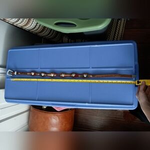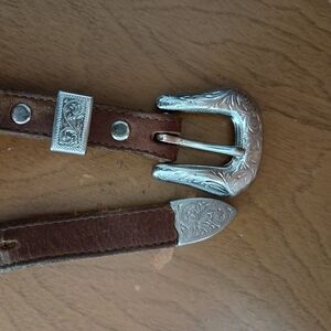 Stylish brown leather belt featuring a classic silver buckle. Perfect for adding a touch of elegance to any outfit.