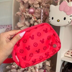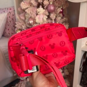 Vibrant red bag with Mickey Mouse pattern. Features lululemon logo. Stylish and fun design.