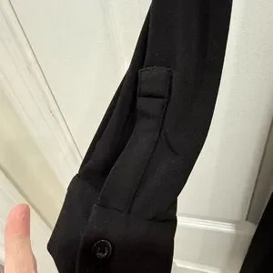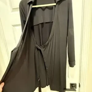 Stylish black dress with a classic shirt dress wrap style. Ideal for work, dinner, or professional wear.
