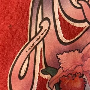 This is an authentic vintage red Aquarius zodiac tee featuring a dreamy 1982 graphic by Planet Taans Inc., New York. The artwork is peak early-80s astrology: rainbow, clouds, florals, zodiac wheel, and a very serene water bearer pouring it out for the universe.