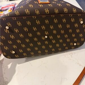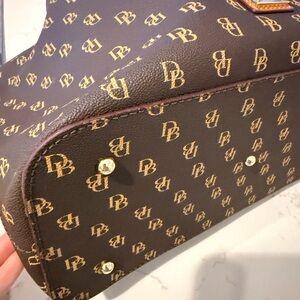 Elegant crossbody bag with signature gold monogram. Ideal for daily wear. This item is a Dooney & Bourke Gretta Brenna Satchel featuring a signature mini-monogram logo print on coated cotton. EUC. I only carried it a handful of times. Pet and smoke free home