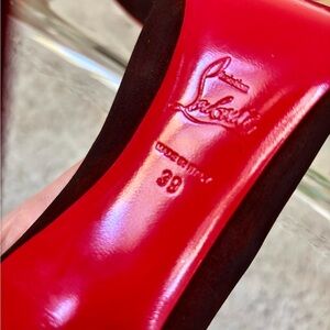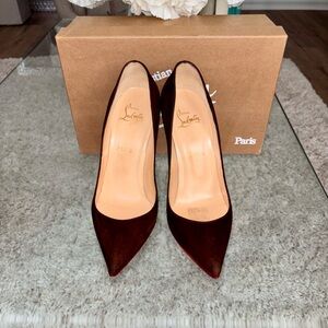 Chic dark brown heels with signature red soles. Perfect for adding a touch of luxury.