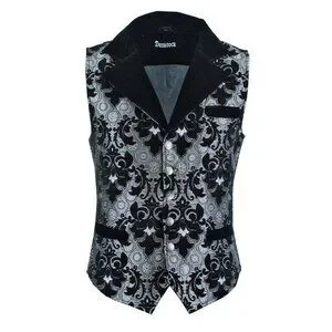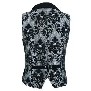 Collarless, great Victorian Style pattern 3 Front Pocket , military style braided banding across front of the Vest, Has nice Cut from back, adjustable back straps, it has Damask printed pattern on the Vest, Made in rich silver /black tapestry fabric. Great Quality Gothic Style Vest, Brocade fabric With 4 Snap Buttons.