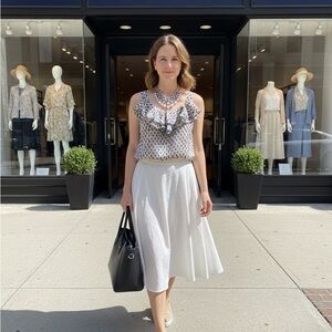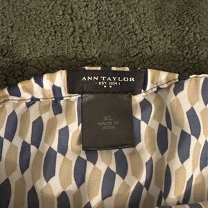 Elegant sleeveless blouse with geometric design. Features navy, white, and beige tones.