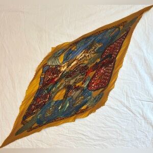 Colors: Golden yellow/mustard background with shades of blue, reds, browns, and beige/cream