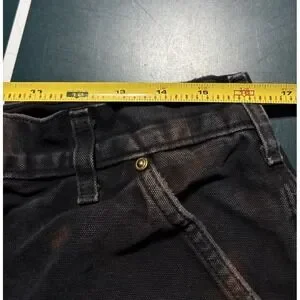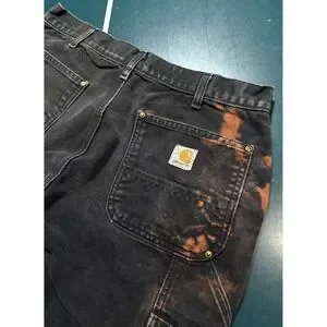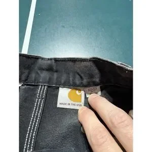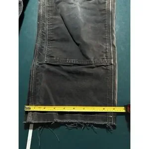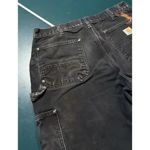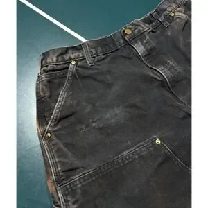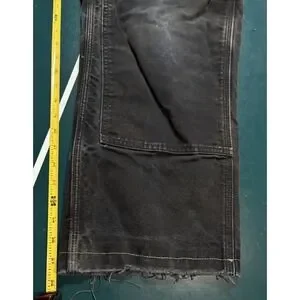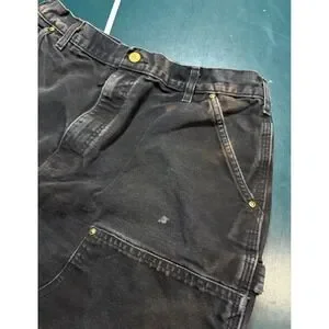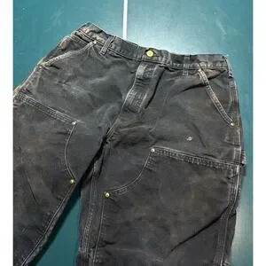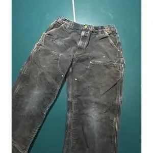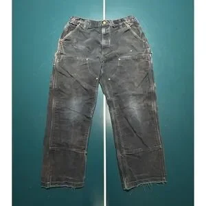 These Vintage Carhartt Double Knee Pants in faded black are a classic piece of American workwear. Made of durable cotton canvas, these relaxed-fit pants feature a mid-rise waist and a flat front design. The pants are accented with the iconic Carhartt logo and have a 5-pocket design, perfect for casual or workwear occasions. With a wide-leg style and a length of 28 inches, these vintage pants are ideal for the colder seasons of winter, fall, and spring. Machine washable for easy care, these pants embody a rugged, grunge-inspired aesthetic from the 90s and 2000s.