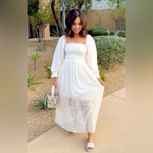 This feminine midi is featured in a soft cotton fabrication and billowy silhouette with smocking at the bodice and eyelet-inspired detailing.
