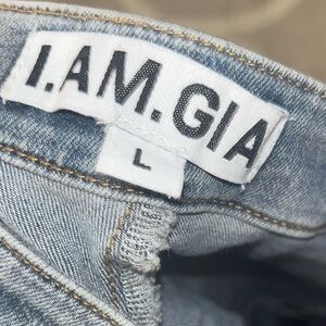 I AM GIA Mini denim skirt with side zipper, featuring a unique design. Size large. Euc