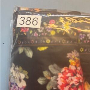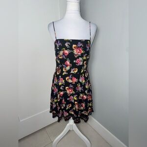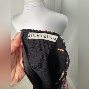 Alice + Olivia designer mini dress in a structured cotton blend that holds its shape beautifully through the waist before opening into a soft flare. Features a straight neckline with thin adjustable straps and a concealed back zipper for a smooth fit. The black base is covered in multicolor florals and finished with a lace border along the hem for a subtle romantic touch. Fully lined and comfortable with a tailored feel.