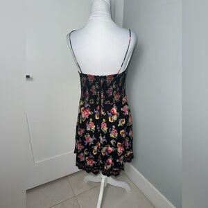 Romantic and feminine Alice + Olivia mini dress featuring a flattering structured bodice and softly flared skirt. The dark floral print paired with delicate lace trim makes it an effortless day-to-night piece; perfect for dinners, vacations, and events where you want to look polished but not overdone.