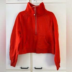 Lulu lemon Athletica Scuba Oversized Funnel Neck Half Zip in true red, with silver hardware. Oversized funnel neck sweatshirt with a high collar, half zip front, cropped length and front kangaroo pouch pocket. Super soft and cozy and stylish. Size M/L- large oversized fit.
