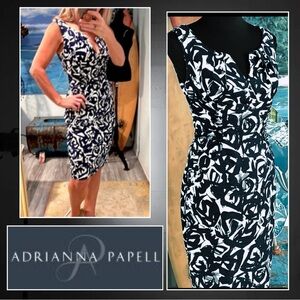 Beautiful dress by Adrianna Papell, size 6, in black and white geometric pattern, linen & cotton blend, with 2% spandex. This dress features a full front zip, and is fully lined for extra comfort. A gorgeous, elegant addition to your wardrobe! For a proper fit, please check your measurements to those of the dress, below: