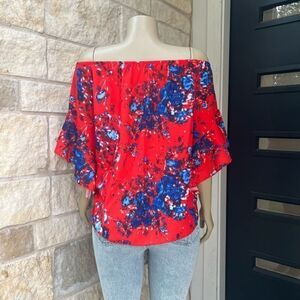 Women's Boho Floral Print Flare Sleeve Off the Shoulder Tie Knot Blouse Small