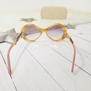 The gentle curves of Chloe's Bonnie sunglasses create a dreamy, looping infinity silhouette. Styled after oversized ‘70s styling, the warm, retro Havana frames have contrasting rose pink temple tips for a modern flair. The lenses are tinted with a light purple gradient, lending a warm, summery glow. They're complete with a gold-toned brand signature to the arms.
