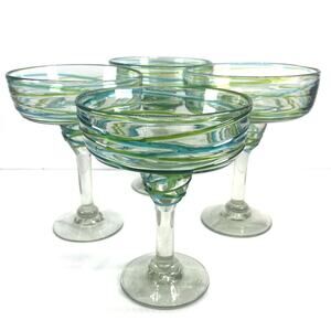 Add a touch of vibrant artistry to your next fiesta with this set of four hand-blown margarita glasses! Each glass features a unique swirl of turquoise and lime green, meticulously crafted to bring a pop of color and a handmade feel to your barware collection. Perfect for enjoying your favorite margaritas or other cocktails in style. Cheers to unique design!