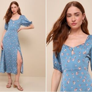 From soirees to weekend brunches, the Lulus Gorgeous Days Blue Floral Satin Puff Sleeve Midi Dress will make you look instantly fabulous for any daytime event! Sleek woven satin boasts a vintage-inspired floral design throughout as it shapes a sweetheart-style neckline and seamed bodice with a cute keyhole cutout at the center, framed by trendy puff sleeves (with elastic at the shoulders and cuffs). The high, fitted waist tops a flowy, A-line skirt that finishes at a chic midi hem with a flirty side slit. Hidden side zipper.