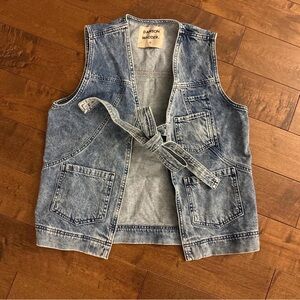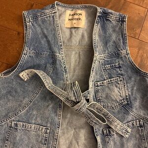 Damson Madder Light blue acid wash denim vest/ gillet with adjustable tie