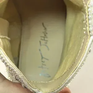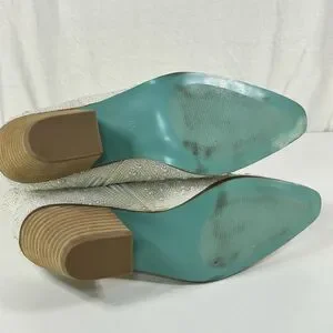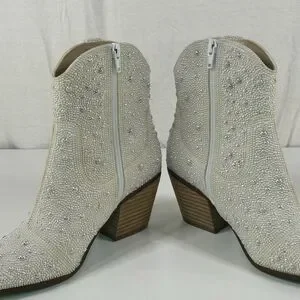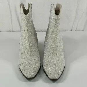 The Betsey Johnson Emory Pearl Rhinestone Western Cowboy Boot is a stylish and glamorous ankle bootie perfect for weddings, parties, or casual outings. With a pointed toe and mid-height block heel, this boot features blue rhinestone accents on the sole, adding a touch of sparkle to the white synthetic upper material. The brand's signature Betsey Johnson style combines with a Western cowboy theme, making it a standout choice for any season. This unique boot in size 6.5 is sure to make a statement and elevate any outfit effortlessly.
