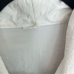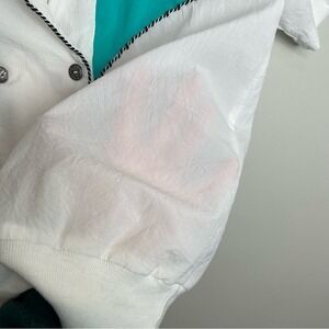 Vintage 1980s short sleeve blouse captures the era's bold aesthetic with a vibrant chevron colorblock design in pink, purple, and teal. This double-breasted top features a distinct shawl collar accented by twisted rope trim and ornate silver-tone floral buttons. The lightweight, slightly sheer white fabric is finished with a ribbed hem for a secure fit, making it a standout piece for retro-inspired styling. Note that the original brand and size tags have been removed.