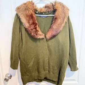 Chic olive cardigan with plush faux fur collar. Ideal for layering. No flaws