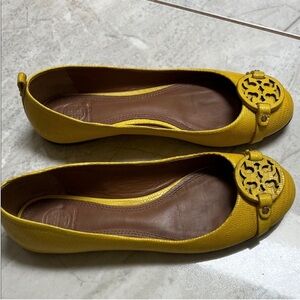 Chic Tory Burch flats in mustard yellow. Features signature logo detail. Ideal for casual elegance.