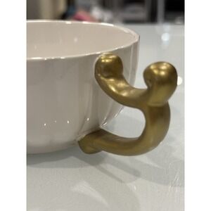 The Pier 1 Imports Grace "Tea For One" includes a white ceramic teapot with gold trim and a matching cup, both featuring an abstract shape and a glossy finish.
