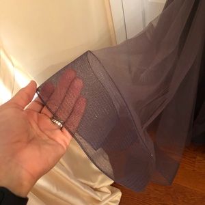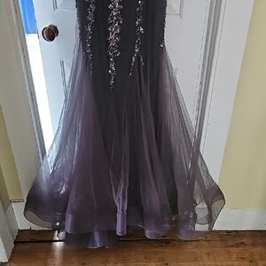 Stunning black gown with silver embellishments. Features a fitted bodice and flowing tulle skirt. Perfect for prom or formal events.