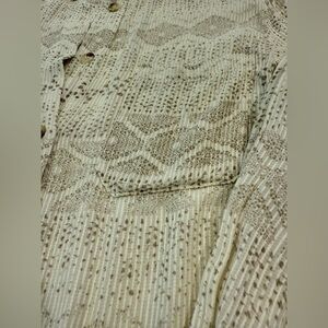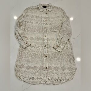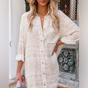 We love a shirt dress paired with tall boots! Our Train Of Thought Button Down Shirt Dress features an ivory and grey geometric pattern with a collar and front button closures.