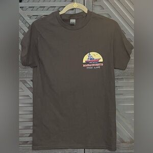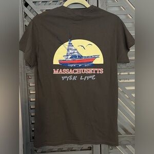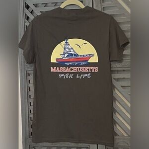 Comfortable Gildan t-shirt. Made from heavy cotton. Men's Small Gildan “Massachusetts Fish Life” charcoal gray T-shirt. The design displays a red and white sportfishing boat set against a yellow sunset, with the words "MASSACHUSETTS" and "FISH LIFE" printed below. Cotton. Classic fit with a crew neckline.