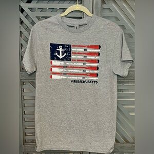 Men's Small Gildan Massachusetts heather gray t-shirt featuring a patriotic, nautical-themed graphic incorporating elements of the American flag and Massachusetts pride. Graphic Elements: The design is a stylized American flag where the red and white stripes are replaced by rowing oars. The blue canton (the upper-left corner) features a large, weathered white anchor instead of stars. Text: The word "MASSACHUSETTS" is printed in a navy blue, hand-lettered style font below the flag graphic. Style: The entire design has a distressed, vintage aesthetic, giving it a worn-in look.