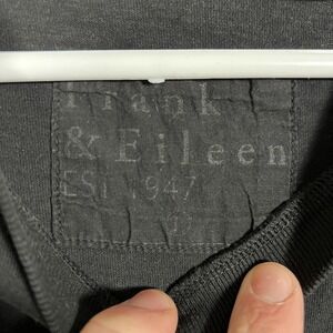 Branding and labels: Interior Frank & Eileen neck label with size D and woven Frank & Eileen Tee Lab content/care tag reading "Made in Sunny California, USA."