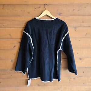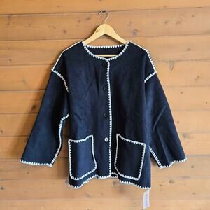 Such a chic coat/cardigan solid black with lighter stitch details. Can be worn opened or buttoned, poly/wool blend. On the heavier side. I also have the gray one posted.
