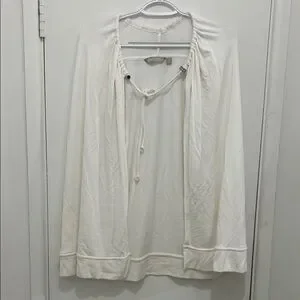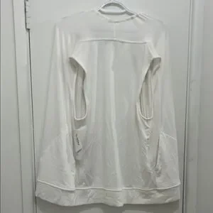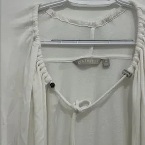 Elegant white cardigan featuring a drawstring neckline. Perfect for layering.