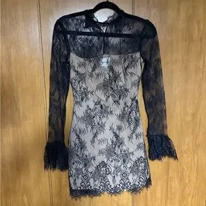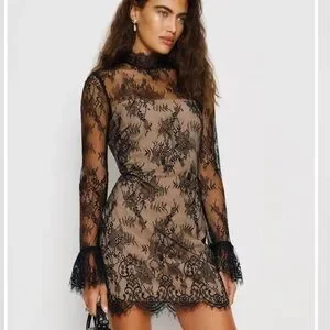 You flirt. Shop the Teanna Dress from Reformation, a long-sleeved mini dress with a mock neck, a scalloped hem, and flared sleeves.