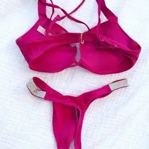 This stunning Victoria’s Secret "Very Sexy" bikini set is the ultimate showstopper. Featuring a vibrant magenta/hot pink hue and drenched in shimmering crystals, this set is designed to catch the light from every angle.