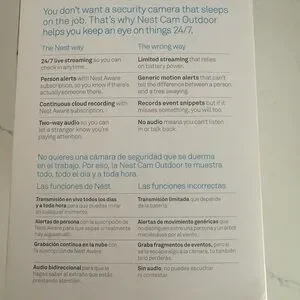 NEST Cam Outdoor with sleek design. Features white body and black lens area. Ideal for security, weatherproof, dependable. Easy to install, 24/7 live streaming capabilities, live alerts & notifications