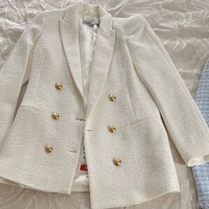 Chic Zara blazers in ivory and light blue tweed. Adorned with gold buttons. Timeless style. White is new with tags blue is only worn once