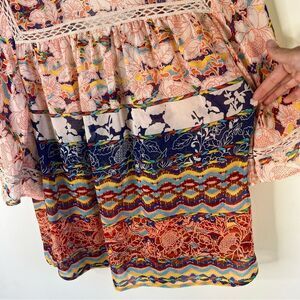 The Anthropologie Meadow Rue Prairie Blossom Floral Boho Top is a stylish and relaxed-fit blouse perfect for casual occasions. Featuring a beautiful floral pattern, short flutter sleeves, and a boat neckline with crochet and tasseled details, this top offers a bohemian theme. Made from a blend of polyester and cotton with a lightweight rayon fabric, this multicolor blouse is both sheared and lightweight, adding a touch of bohemian to any outfit. Ideal for women looking for a unique and comfortable piece to add to their wardrobe. In excellent preloved condition. From a smoke, pet free home