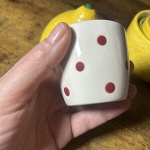 This charming vintage Jessie Steele / C.R. Gibson nesting measuring cup set features five colorful ceramic cups, each with its own playful pattern and a whimsical lemon design that adds personality to any kitchen. Perfect for collectors, bakers, or anyone who loves cheerful retro‑inspired kitchenware, this set blends function with decorative appeal.