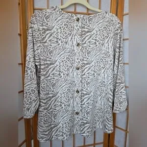 For sale new with tag WOMENS BOBEAU ANIMAL PRINT 3/4 SLEEVES SOFT LIGHT STRETCH RAYON/ POLYESTER MIX PULLOVER BLOUSE WITH BEAUTIFUL BUTTONS ON THE BACK LINE. SIZE Medium.