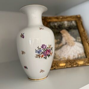 Beautiful, authentic, vintage porcelain vase by Reichenbach, featuring a classic white body adorned with delicate multicolor floral motifs and elegant gold trim at the rim and base. The floral pattern includes soft pinks, purples, blues, and warm accent tones, giving it a timeless European-inspired look.