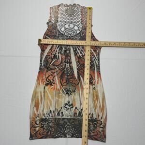 Y2K Vintage Rue 21 Size Small Boho crochet back tank top with bold tribal floral print in warm tones of orange, black, and beige. Features gathered pleats at the front and stunning open lace detail on the racerback. Super soft, stretchy, and flattering fit. Perfect for festivals, summer vibes, or layering.